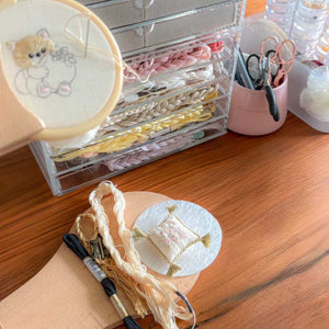 育兒關係,之前暫休了約一年時間, 最近重拾針線,繼續第7年的刺繡作家活動。於育兒之間創 作,製作時間難免散亂。小朋友入睡後才可以安靜下來,沉醉於自己的創作空間。