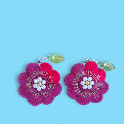 [one heart] 日本手作花花刺繡耳環 ,紅色 x 紫色