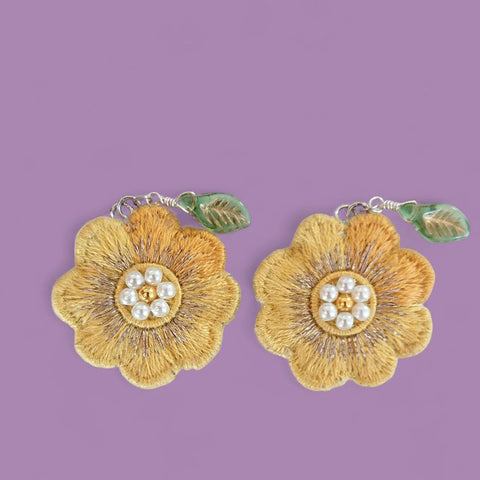 [one heart] 日本手作花花刺繡耳環 ,黃色 x 黃色